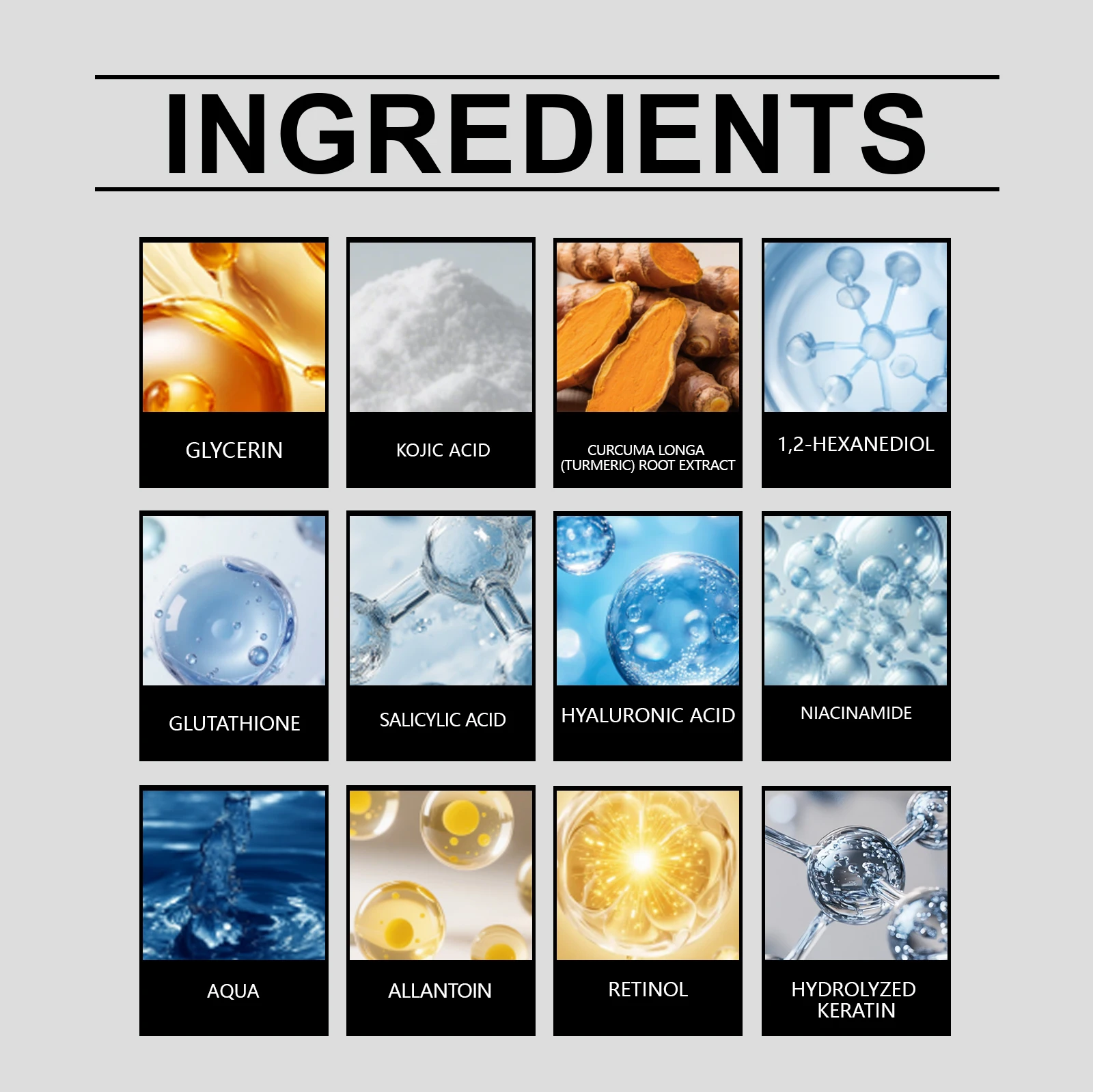 INGREDIENTS:AQUA、GLYCERIN、1,2-HEXANEDIOL、ALLANTOIN、HYALURONIC ACID、SALICYLIC ACID、NIACINAMIDE、KOJIC ACID、CURCUMA LONGA (TURMERIC) ROOT EXTRACT、GLUTATHIONE、RETINOL、HYDROLYZED KERATIN
